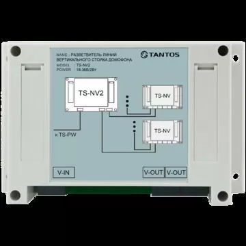 TANTOS TS-NV2 - компонент многоквартирной домофонной системы TANTOS, предназначен для разделения линии вертикального стояка на 2 ветви. В каждой ветви может быть включено до 99 этажных коммутаторов TS-NV. Может использоваться как усилитель-повторитель для длинных линий связи (более 100-150 метров). Монтируется на DIN-рейку или накладным образом. Питание 18-36 В (от блока питания TANTOS TS-PW). Рабочая температура -30… +50 ⁰С.