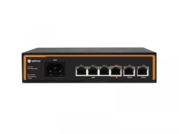 PoE-порты соответствуют стандартам PoE IEEE802.3af/at. 4 порт у коммутатора Optimus U1I-4F1b/2F соответствует стандартам IEEE802.3af/at/bt. Каждый порт подает питание мощностью до 30 Вт (в bt стандарте до 60 Вт) на сетевое оборудование. Это позволяет размещать оборудование в труднодоступных местах вне зависимости от расположения электрических розеток и минимизировать прокладку кабеля. Максимальная дальность подключения оборудования составляет 250 метров. Коммутатор сам определяет длину кабеля и переключает режимы функцией Self-Adaptive.