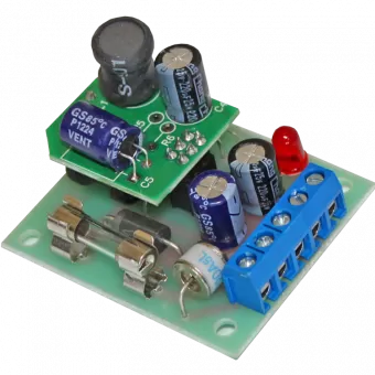 Преобразователь напряжения для видеокамер. Входное нестабилизированное напряжение 18—60В, выход - 12В, 0,4А. Защита выхода от перегрузки и КЗ, грозозащита по питанию. Для установки в термокожух камеры, размер 51х43x30 мм.