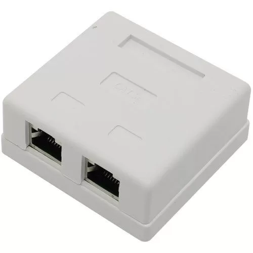 Экранированная компьютерная розетка настенного монтажа. Соответствует характеристикам категории 5е. Имеет 2 порта RJ45 (8P8C). Розетка предназначена для подключения компьютерных и телефонных кабелей в сеть.