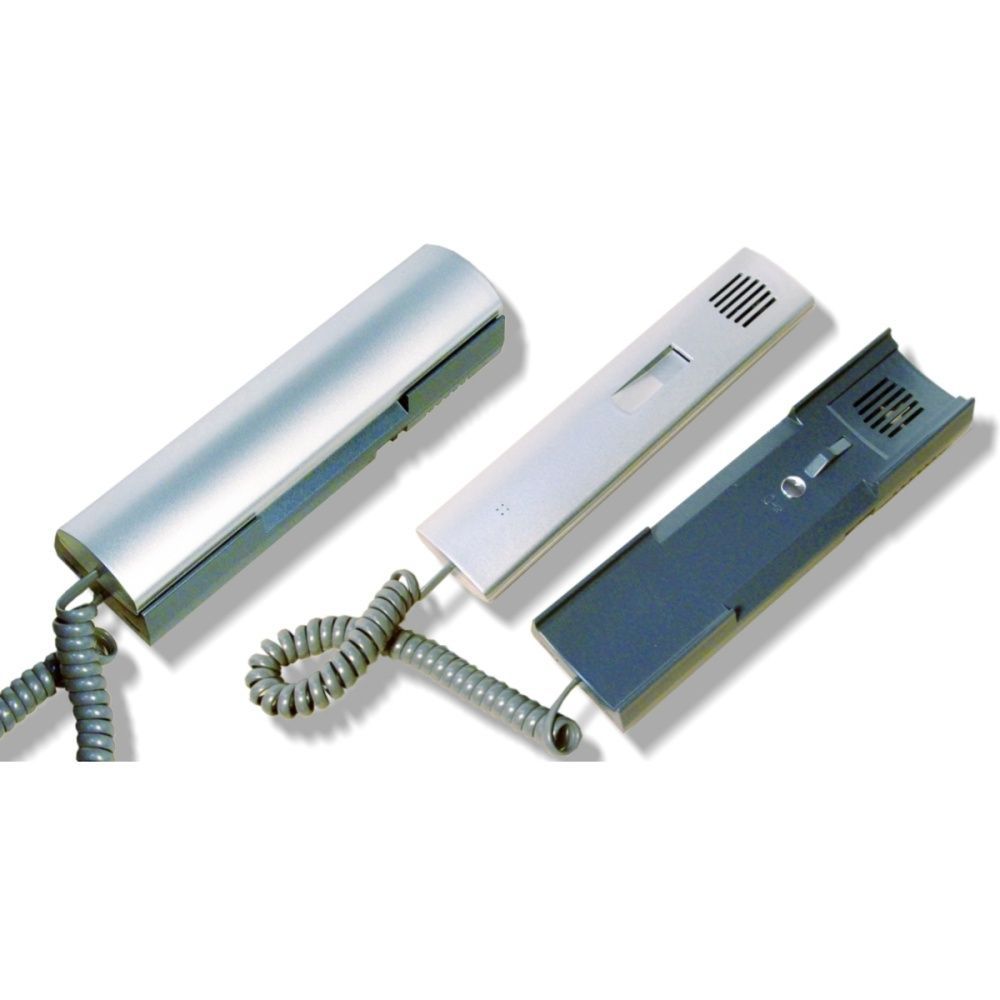 Компактная простая трубка для домофонов с координатной линией связи, возможность отключения сигнала вызова, трубка покрашена (серый металлик /синий металлик); комплектуется крепежом (дюбеля, шурупы)