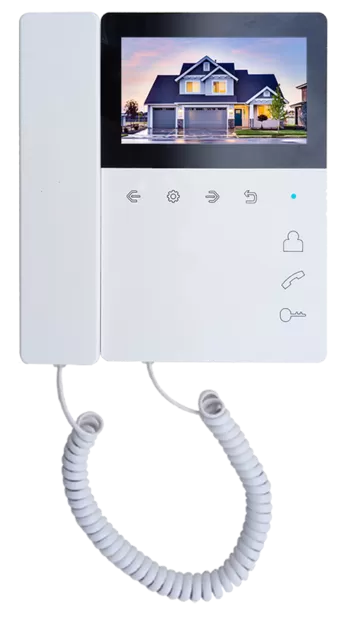 Монитор цветного видеодомофона с трубкой на магните, экран 4,3 дюйма, сенсорные кнопки, встроенный блок питания, вертикальное исполнение. TFT LCD 4,3" 480x272, PAL/NTSC, 2 панели, 2 камеры, до 4-х шт. в параллель. Питание 220В. Габариты 160х180х32мм